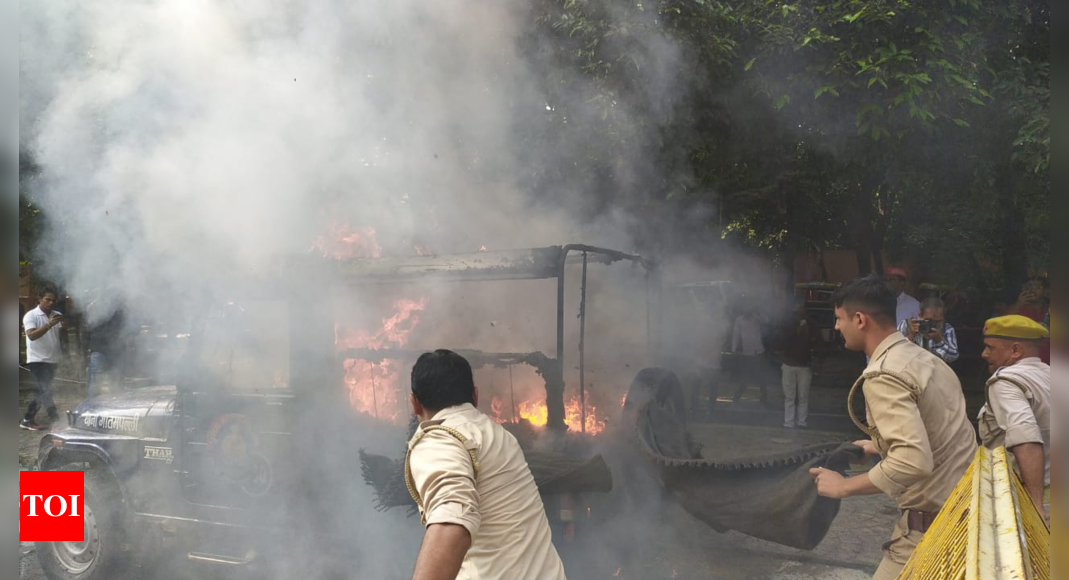 Akhilesh left his house but could not proceed much further. He, along with party workers staged a sit-in close by. A police vehicle was set on fire outside Gautum Palli police station, not far from the sit-in site.